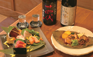 日本酒好きなら「日本酒三種飲み比べ」をぜひ。彩の匠地鶏を使った朴葉味噌焼き、鮮度抜群のお刺身、そして熱々のおでんが一押しメニューです。
