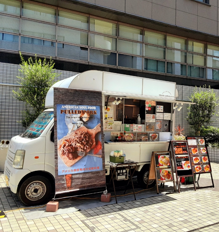 キッチンカーにてアメリカ南部郷土料理のプルドポークという商品販売を行っております。